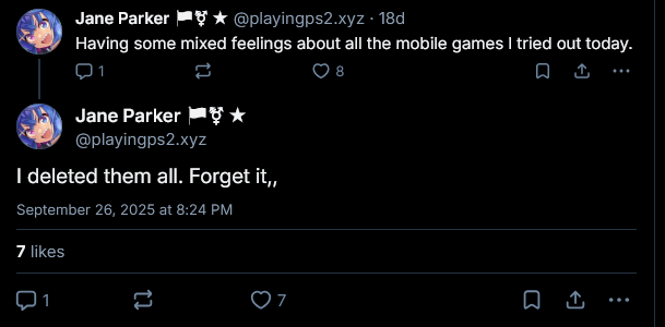 So yes, the friends I have and the Uma community were the big difference. If you talked to me about horses on Bluesky, you are the Uma community. The elements that made it an easier, more understandable game are a somewhat small part of that. In some ways, I suppose getting into something through your friends is a healthier, more organic way than just strictly trying to collect horses and their shiny cards out of some sense of pride or worshipful devotion of your one favorite horse.